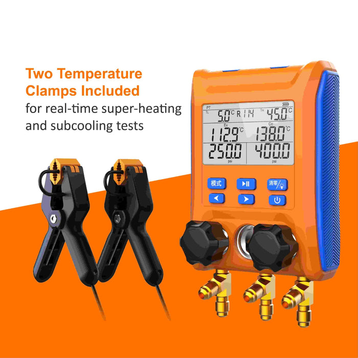 Das digitale Manometerset LMG-10 von Elitech ist der perfekte Ersatz für herkömmliche analoge Manometer. Es speichert 88 Arten von Kältemitteldruck-Verdampfungstemperatur-Datenbanken. Ausgestattet mit einem großen LCD-Display, einem 2-Wege-Ventilblock mit drei Anschlüssen und einem Aufhängehaken ermöglicht das HVAC/R-Gerät eine komfortable Anwendung. Echtzeitmessungen der Überhitzung und Unterkühlung erspart automatisch die Mühe manueller Berechnungen.