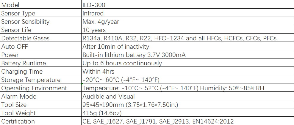 • Premium-Infrarotsensor*    Dieser Kältemittelleckdetektor verfügt über einen Premium-Infrarotsensor, der eine lange Lebensdauer von über 10 Jahren hat und dessen Empfindlichkeit mit der Zeit nicht nachlässt das allerbeste Werkzeug zur Lecksuche in Klimaanlagen.