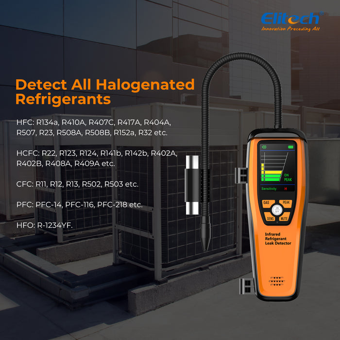 • Ein Allrounder in der Lecksuche*   Elitech ILD-100 ist ein schneller, zuverlässiger Lecksucher für alle gängige Kältemittel, einschließlich R134a, R410A, R32, R22, HFO-1234 und alle HFCs, HCFCs, FCKWs, PFCs.