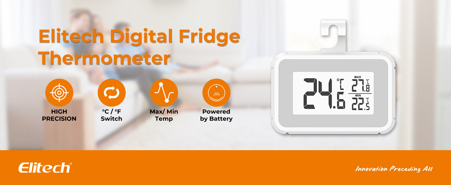 Elitech TM-2T Fridge Thermometer features a large, clear LCD display with max/min temperature records for precise monitoring from -4°F to 122°F (±1.8°F accuracy). Designed for flexible placement with a hook, magnet, and stand, it’s waterproof (IPX3), food-safe, and ideal for fridges, freezers, and more. Battery included.