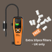 Elitech ILD-300 con detector de fugas para todos los refrigerantes comunes CFC, HFC, HCFC, PFC y HFO, incluye detector de fugas, luz ultravioleta, cable de carga, adaptador de corriente, filtros de repuesto y estuche de transporte. El sensor de infrarrojos cuenta con una larga vida útil de más de 10 años, sensibilidad no degradable y limitación de falsas alarmas, que es el mejor sensor en el sistema de detección de fugas. Además, con selección de gas, registro de picos, diseño ergonómico exclusivo e innovadora pantalla LCD TFT grande, el detector optimiza la experiencia del usuario y presenta los resultados de detección de manera más intuitiva y diversa. Con ILD-300, estará idealmente equipado para llevar a cabo una detección de fugas rápida y confiable.