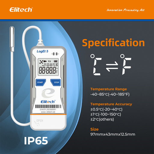 Elitech LogEt 5 THE registrador de datos de temperatura y humedad registrador reutilizable con sonda externa, datos de sombra, informe automático PDF/CSV, 32000 puntos