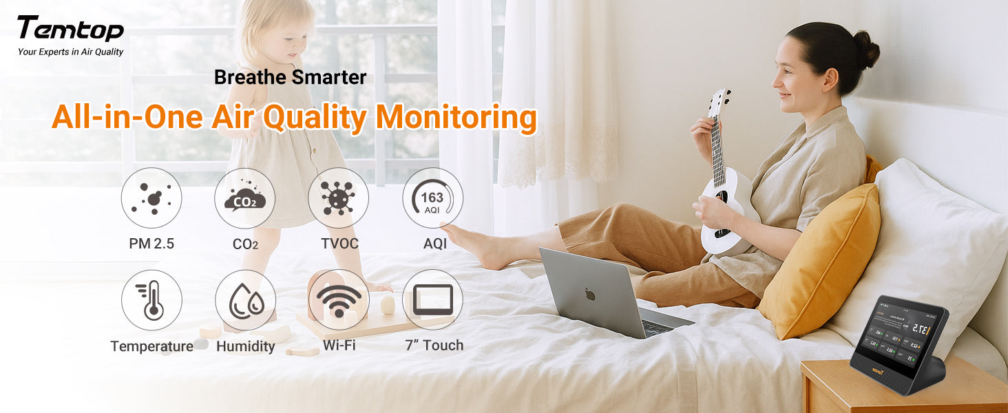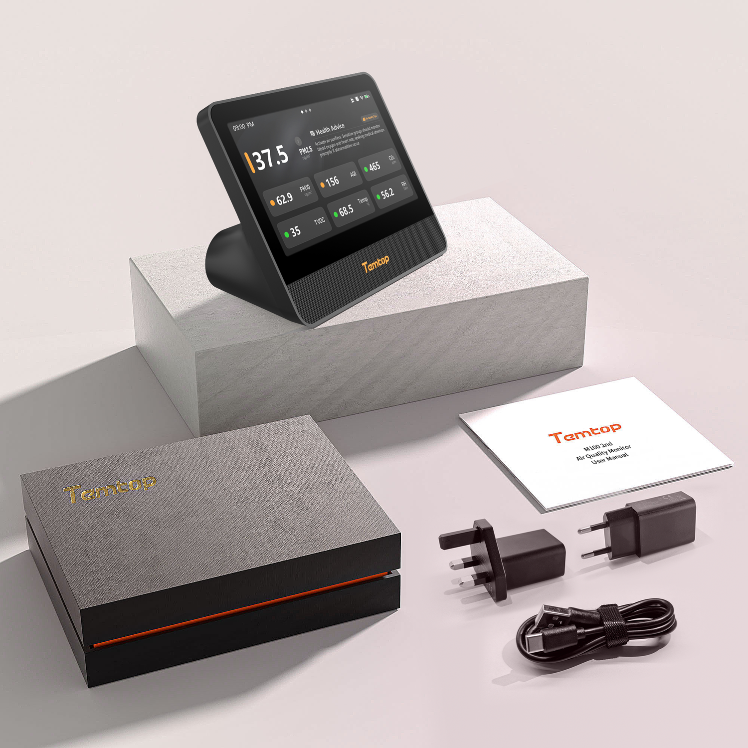 Temtop M100 2nd Gen is a smart indoor air quality monitor featuring a 7-inch touchscreen and high-precision sensors to track PM2.5, PM10, CO₂, TVOC, temperature, humidity, and AQI in real time. With Wi-Fi and optional LoRa connectivity, it supports multi-room monitoring, trend graphs, customizable alerts, and manual calibration—ideal for homes, offices, schools, and professional air-quality management.