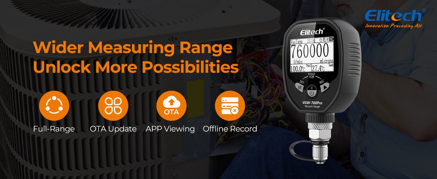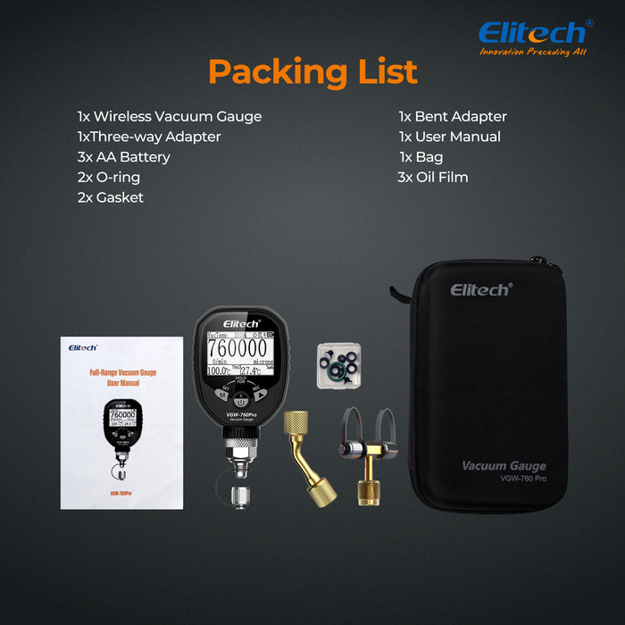 Elitech VGW-760Pro Jauge micronique à gamme complète, jauge à vide numérique sans fil avec adaptateur testeur de pression CVC, alarmes via application, enregistrement hors ligne, 1/4" SAE