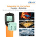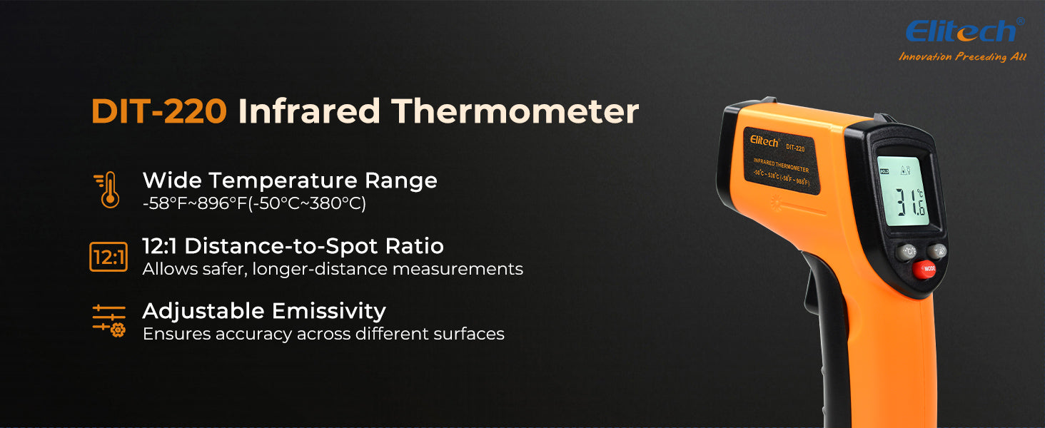 Elitech DIT-220 Infrared Thermometer offers fast, accurate, non-contact temperature readings from -50°C to +50°C (-58°F to +122°F) with ±1°C precision and a rapid 500ms response time. It features laser targeting for pinpoint accuracy, adjustable emissivity (0.10–1.00) for various surfaces, and smart self-calibration with MAX/MIN/Ambient modes. Designed for ease of use, it includes a backlit LCD, one-trigger operation, °C/°F switching, and a 12-hour battery life. Built for durability and versatility, it’s perfect for HVAC, automotive, industrial, and kitchen applications.